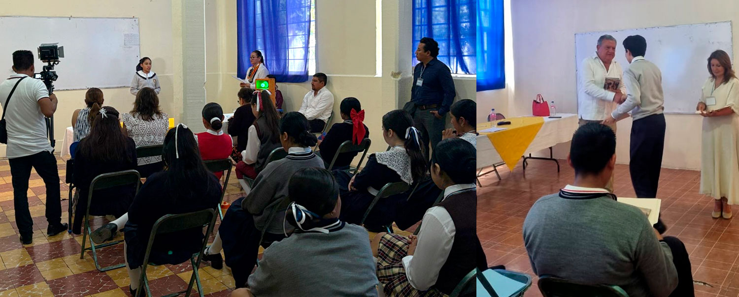 Ambos estudiantes recorrieron con entusiasmo más de dos horas de camino desde Tehuacán para llegar a la sede, acompañados con orgullo y compromiso por su profesora de Lengua Materna, Lic. Zurely Acosta Solís, quien ha guiado con dedicación el proceso de formación de estas voces jóvenes junto con la Mtra. Inés Muñoz Suárez.